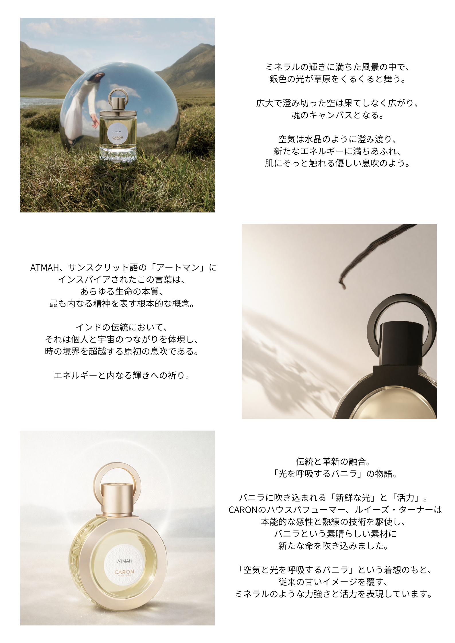 CARONでの初めての作品である「アトマ」では、今までにない、新しいバニラの香りを生み出し、バニラの概念を変えていく。